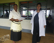 ・教育省(Ofisi AKO)教育長Olivia Mafileoに“The Textbook of Dental Health For Children”の活用について説明後、28校分のTextbookを渡す